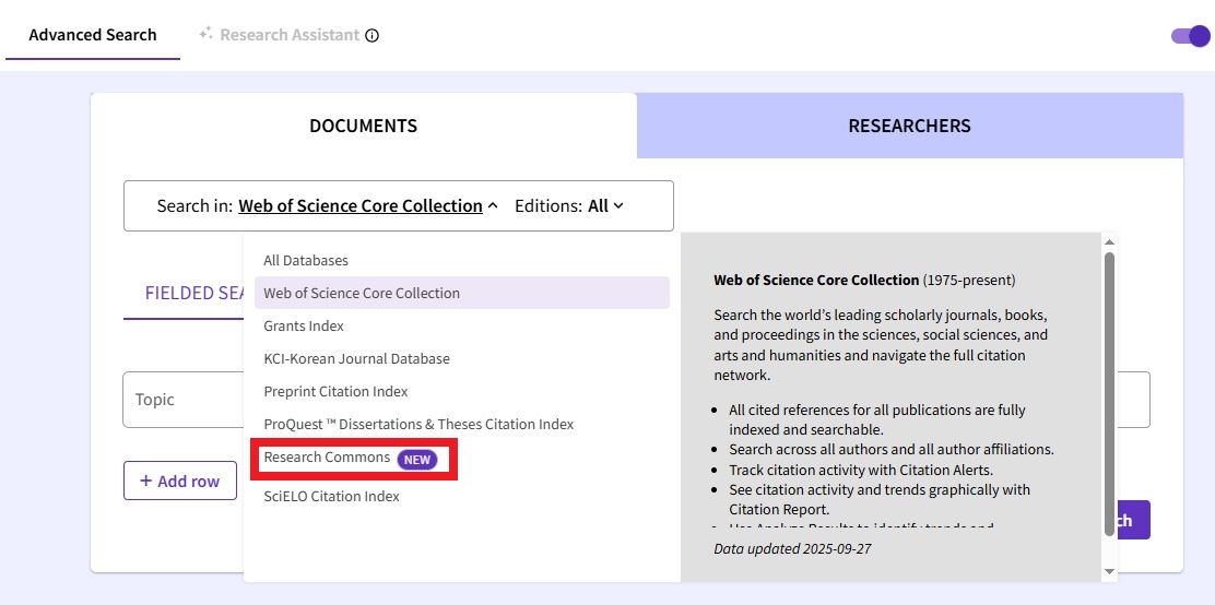 Research Commons, Core Collection’ın bir parçası olmayan ayrı bir veritabanıdır. Esnek keşif ve kapsamlı araştırma değerlendirmesini mümkün kılmak için genişletilmiş içerik sunan Research Commons şunları sağlar: